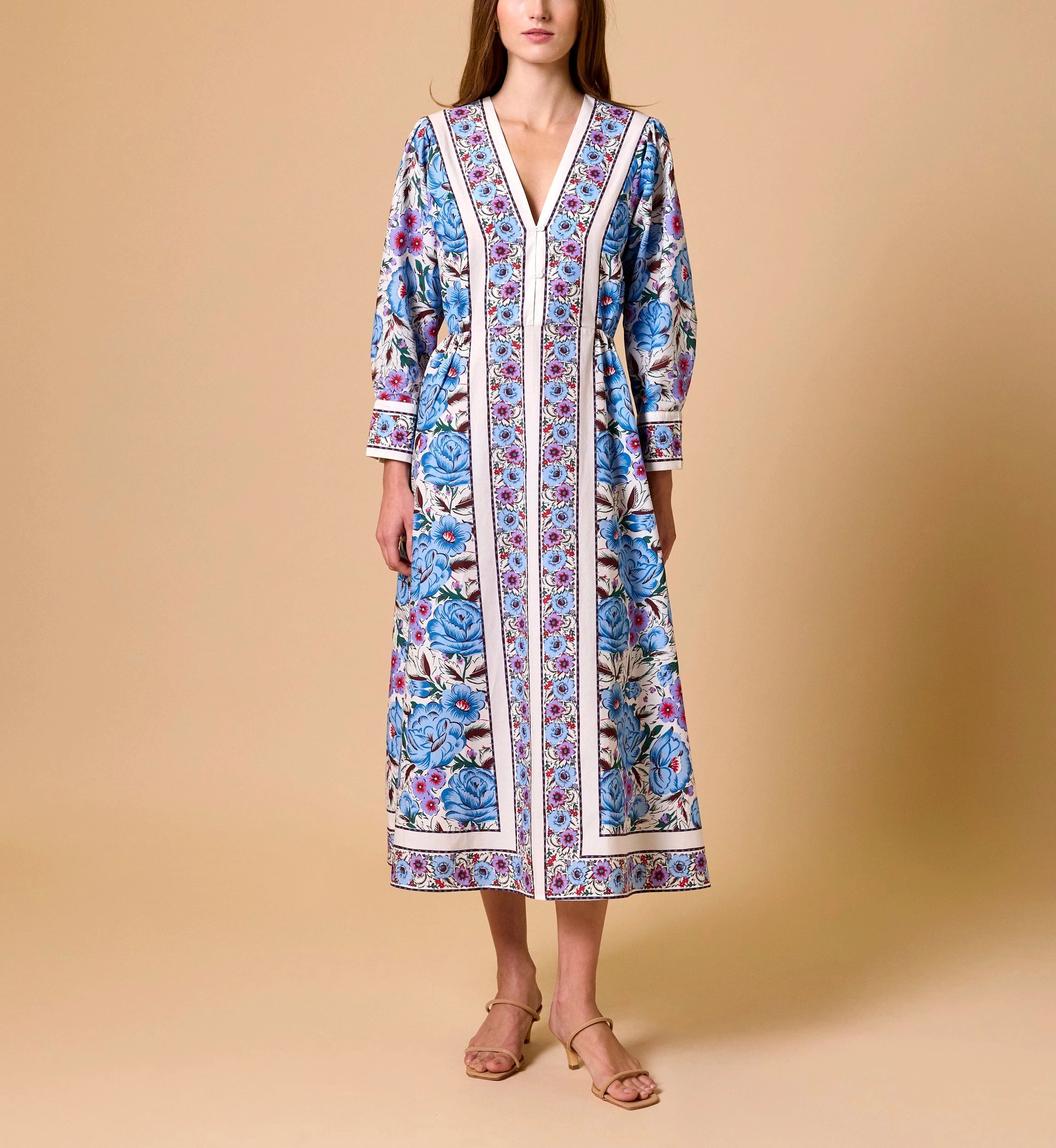 The Blanche Midi Dress showcases a vintage inspired floral print that brings a timeless charm to this refined silhouette. Designed with long sleeves and a center front button closure, this midi dress is detailed with tailored cuffs at the sleeve edge finished with delicate buttons. A discreet zipper at the center back ensures a smooth, comfortable fit. Thoughtfully crafted, the Blanche Midi Dress is a beautiful choice for both everyday moments and special occasions.