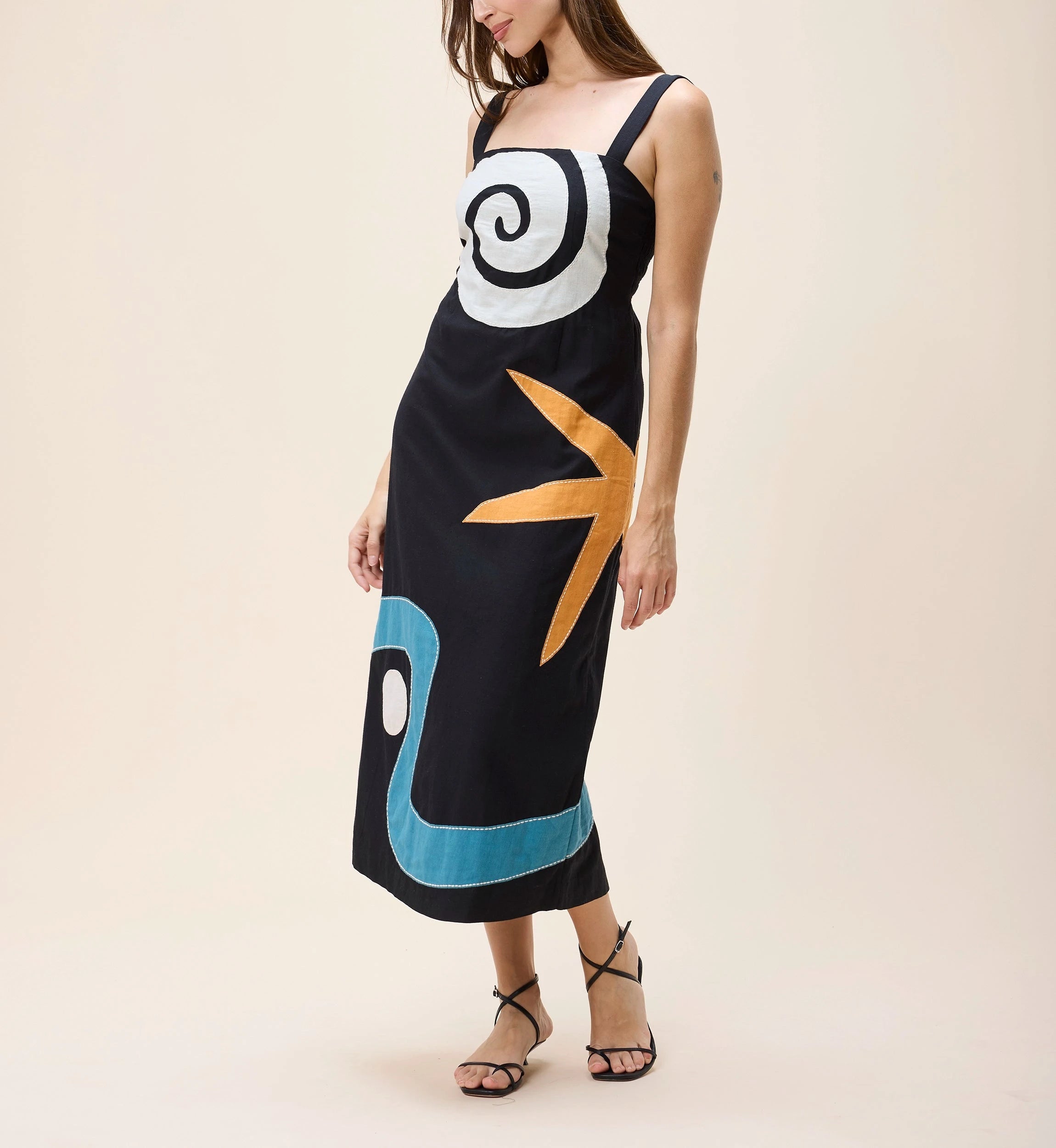 The Brie Midi Dress is a striking, handcrafted silhouette ethically made in India from a breathable blend of 85% cotton and 15% flax. Designed with a clean square neckline and wide shoulder straps for comfortable support, this fitted midi features smocked panels at the back for an adjustable, flattering fit. Bold embroidered appliqué adds an artisanal touch, while a hidden back zipper ensures a smooth, refined finish.