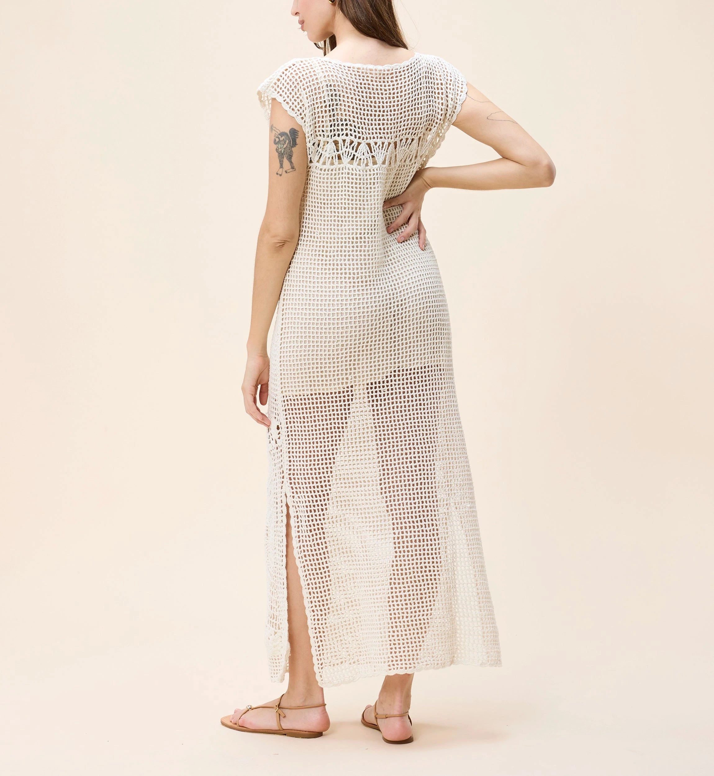 Crafted from 100% cotton, the Calira Cover-Up Dress blends artisanal texture with effortless elegance, making it an essential layer for any warm-weather escape. Featuring an intricate crochet design with subtle shell-inspired motifs, this throw-on silhouette is finished with a removable mini slip lining for customizable coverage. Its relaxed yet refined shape makes it perfect for pairing over any Cleobella swim.