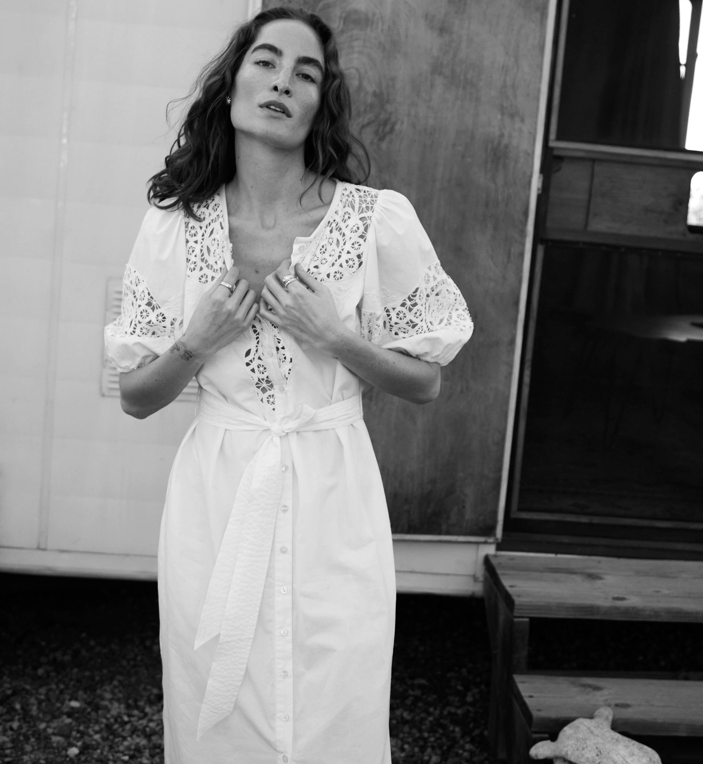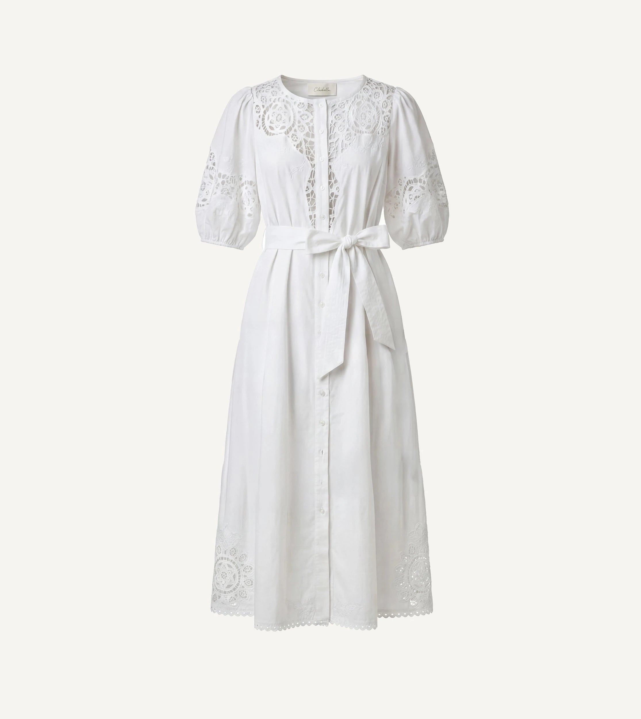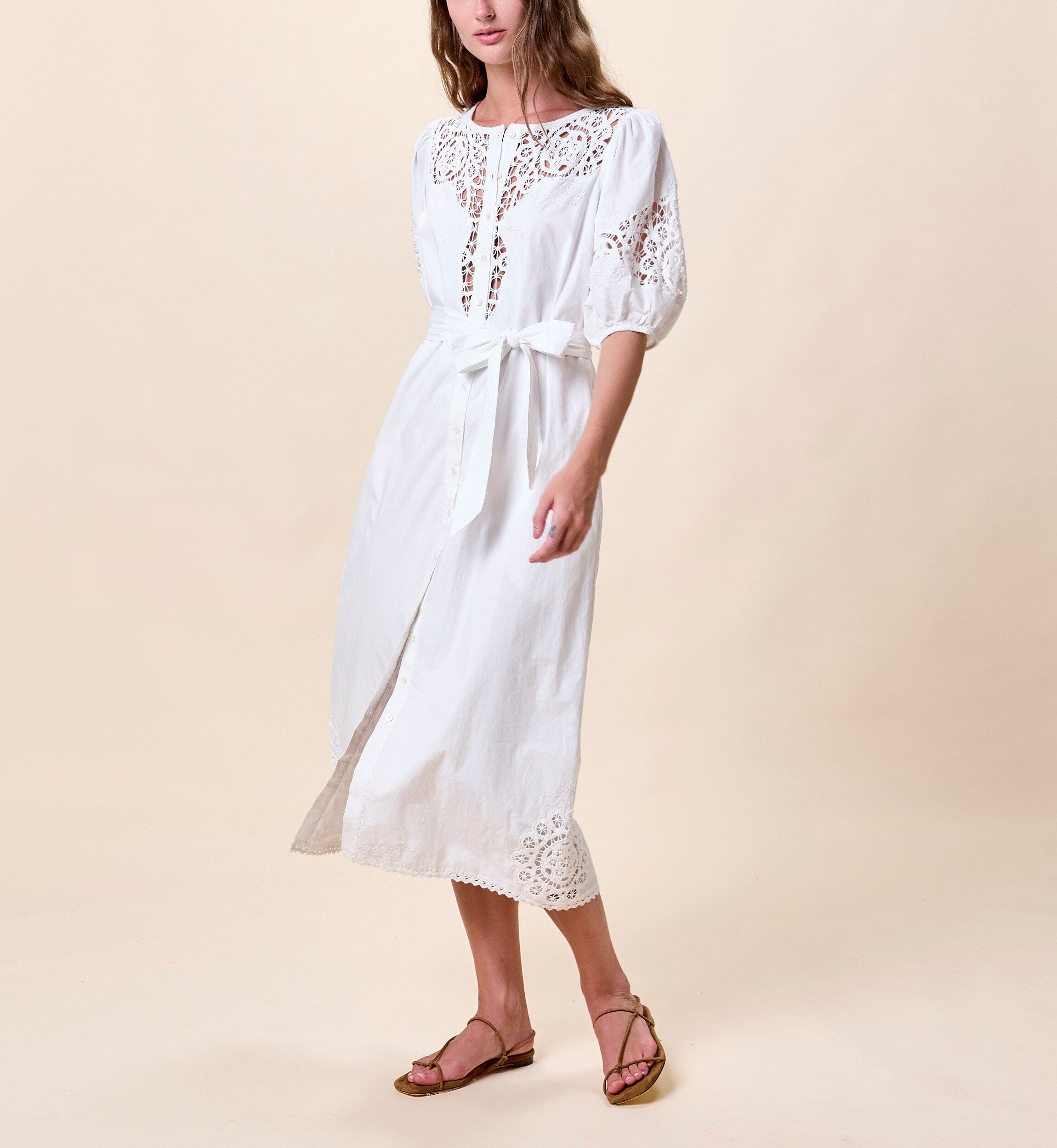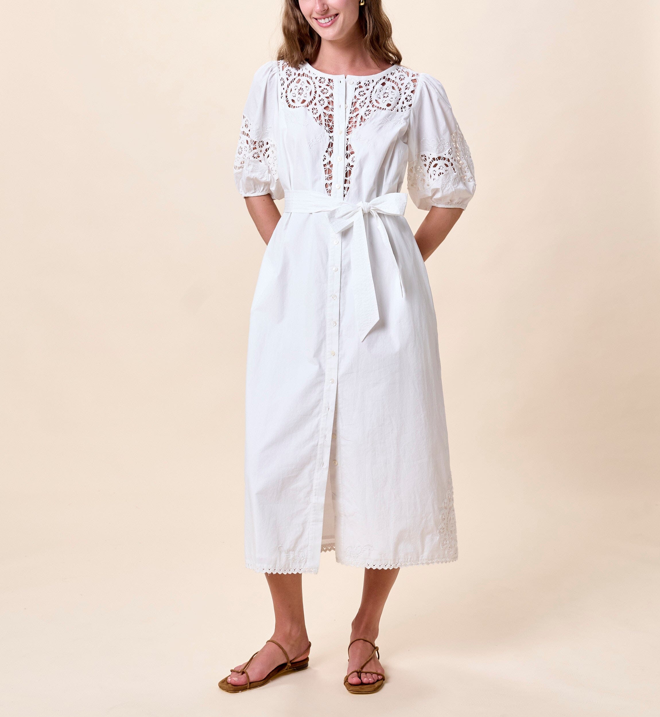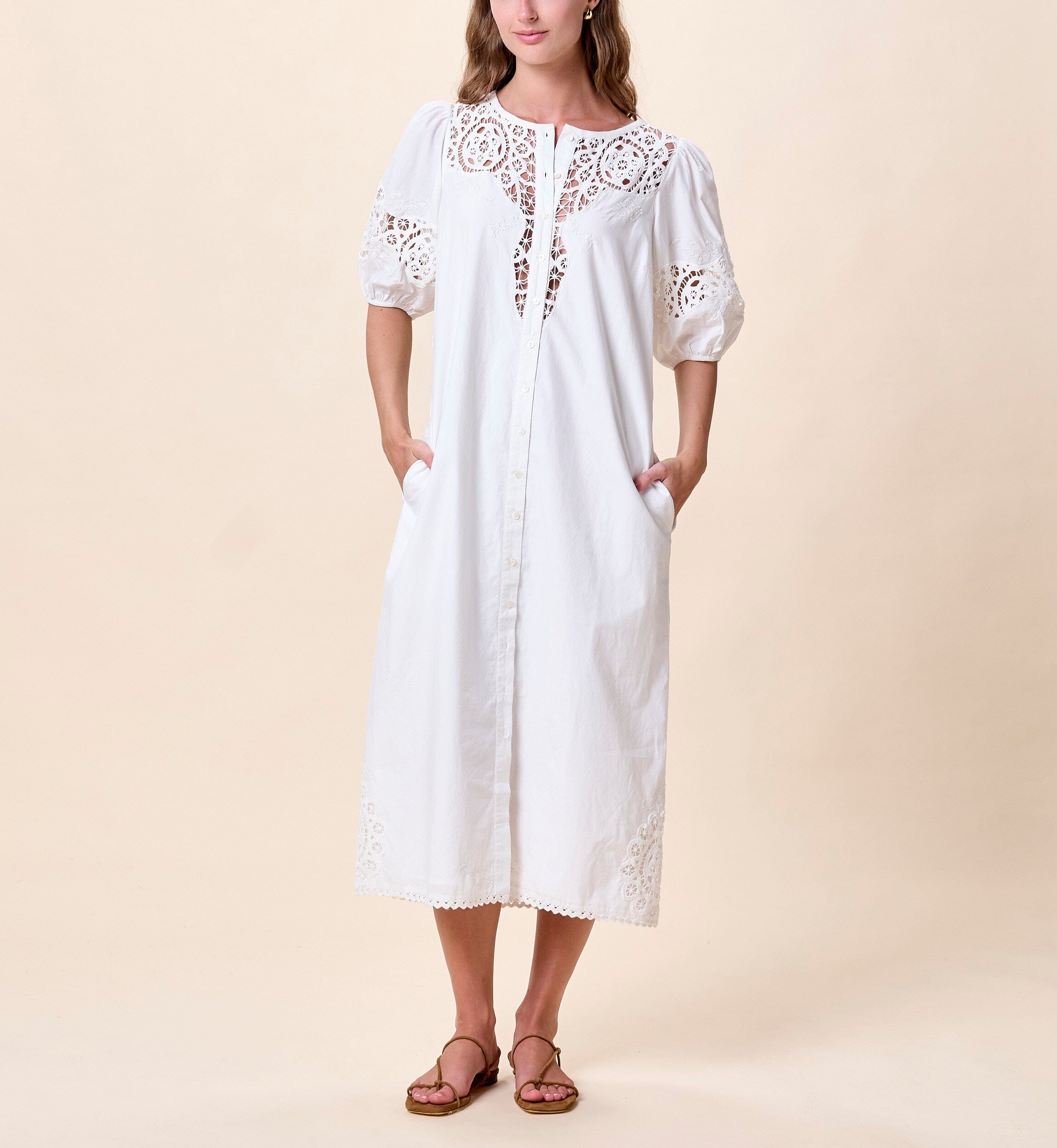 The Franny Midi Dress is a romantic take on a classic button down silhouette, featuring elbow length sleeves with soft elastic cuffs for a comfortable, relaxed fit. Delicate lace inserts and intricate embroidery add subtle texture and charm, while lace trim along the hem completes the vintage inspired look. Perfect for warm days and special moments alike, the Franny Midi Dress combines thoughtful details with timeless style.