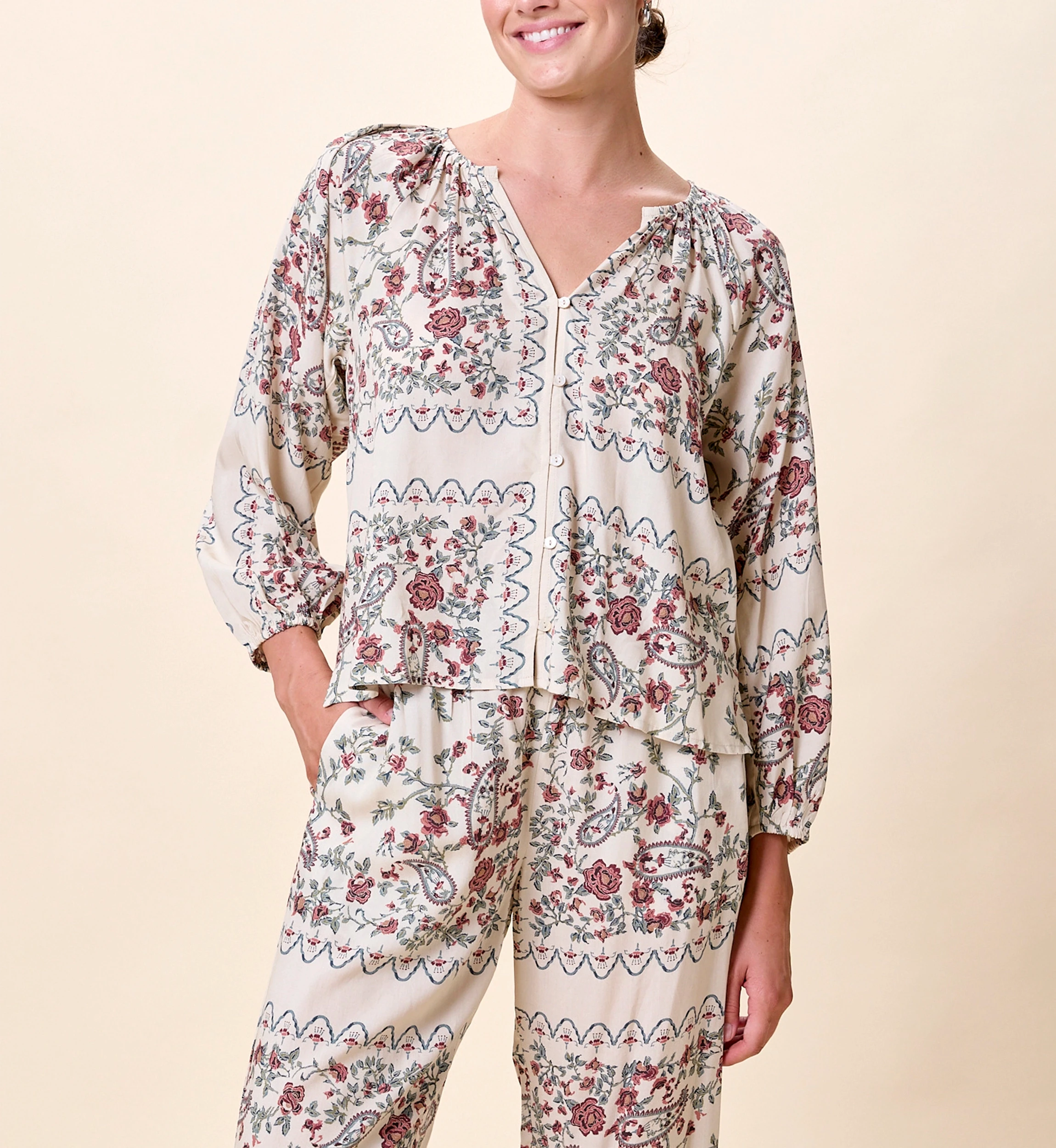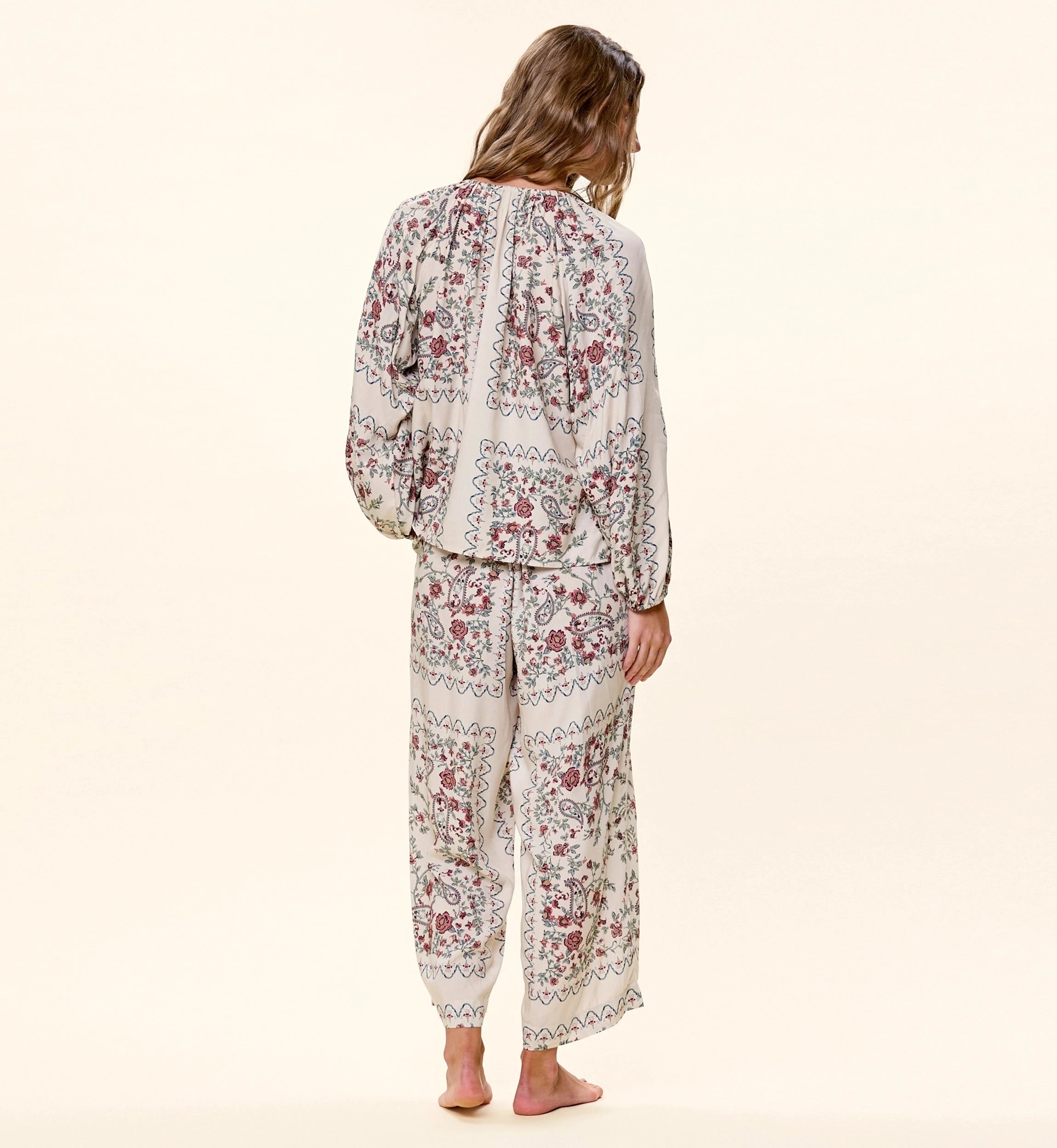 Introducing the Relinda Pajama Set from our Hati Home x Cleobella Collection — a true celebration of The Art of Getting Comfortable. Designed with effortless elegance in mind, this set captures the perfect balance of beauty, ease, and timeless style. Crafted in our signature La Ramo print — the same fabric featured across the Hati Home x Cleobella furniture line — the Relinda Pajama Set creates a seamless connection between your home and wardrobe. The classic button-down top is finished with softly elasticated cuffs for added comfort, while the matching pants feature an easy pull-on waistband and side pockets. Elevated yet relaxed, the Relinda Pajama Set transitions effortlessly from slow mornings to cozy evenings, embodying the art of everyday living in style.