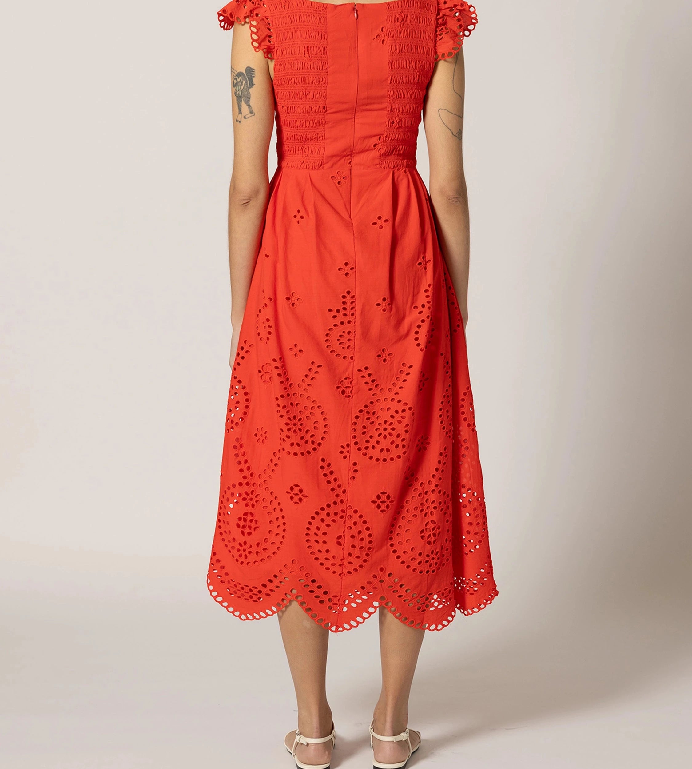 Ethically handmade in India from 100% organic cotton eyelet, the Kiki Midi Dress is the perfect dress for the warm weather. Elegant and chic, this dress features a delicate scalloped eyelet trim at the sleeve and hem and shirring at the hip for a unique dropped waist detail. Complete with pockets and a flattering square neck design, the Kiki is a timeless piece that will have you turning heads.