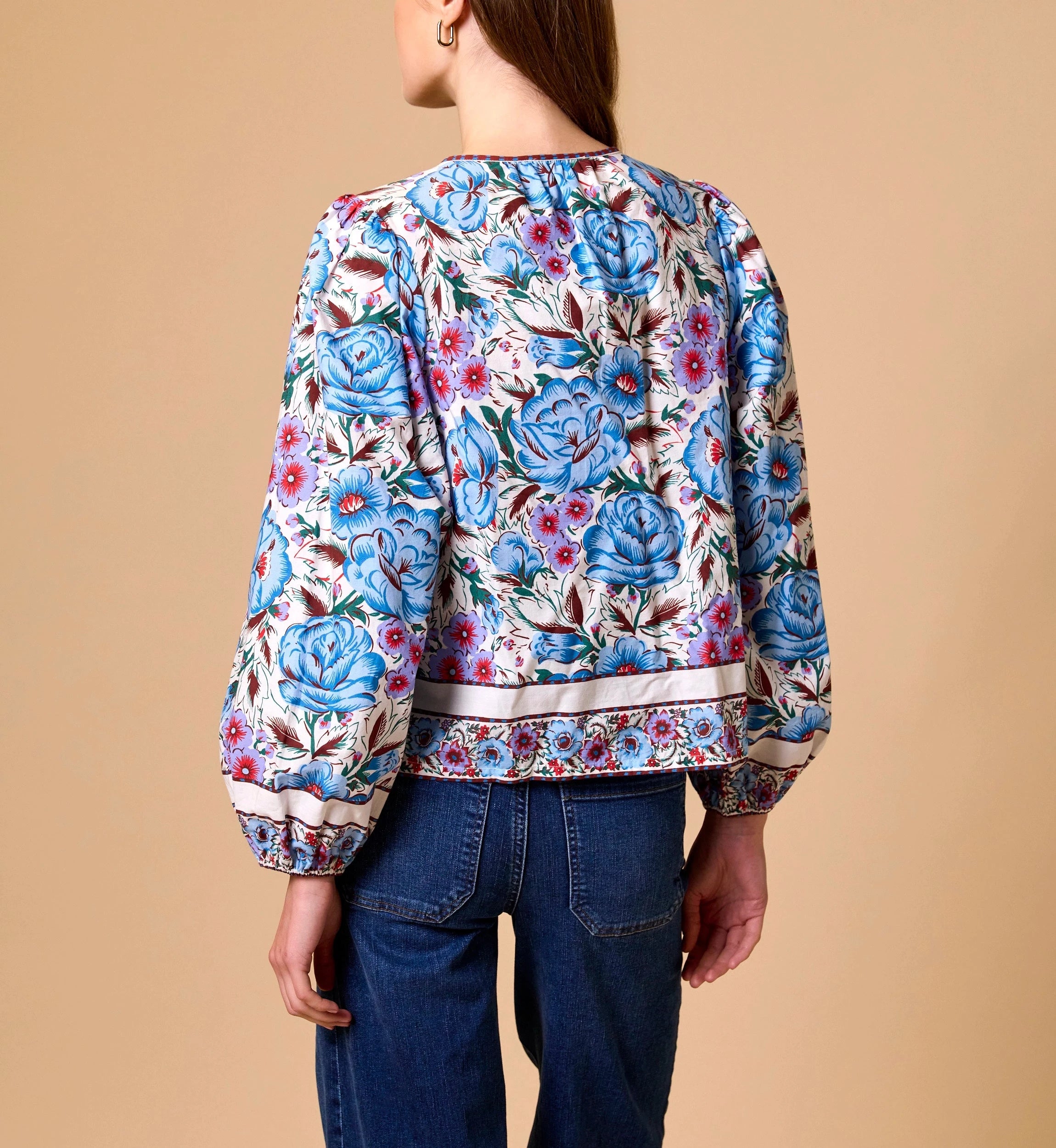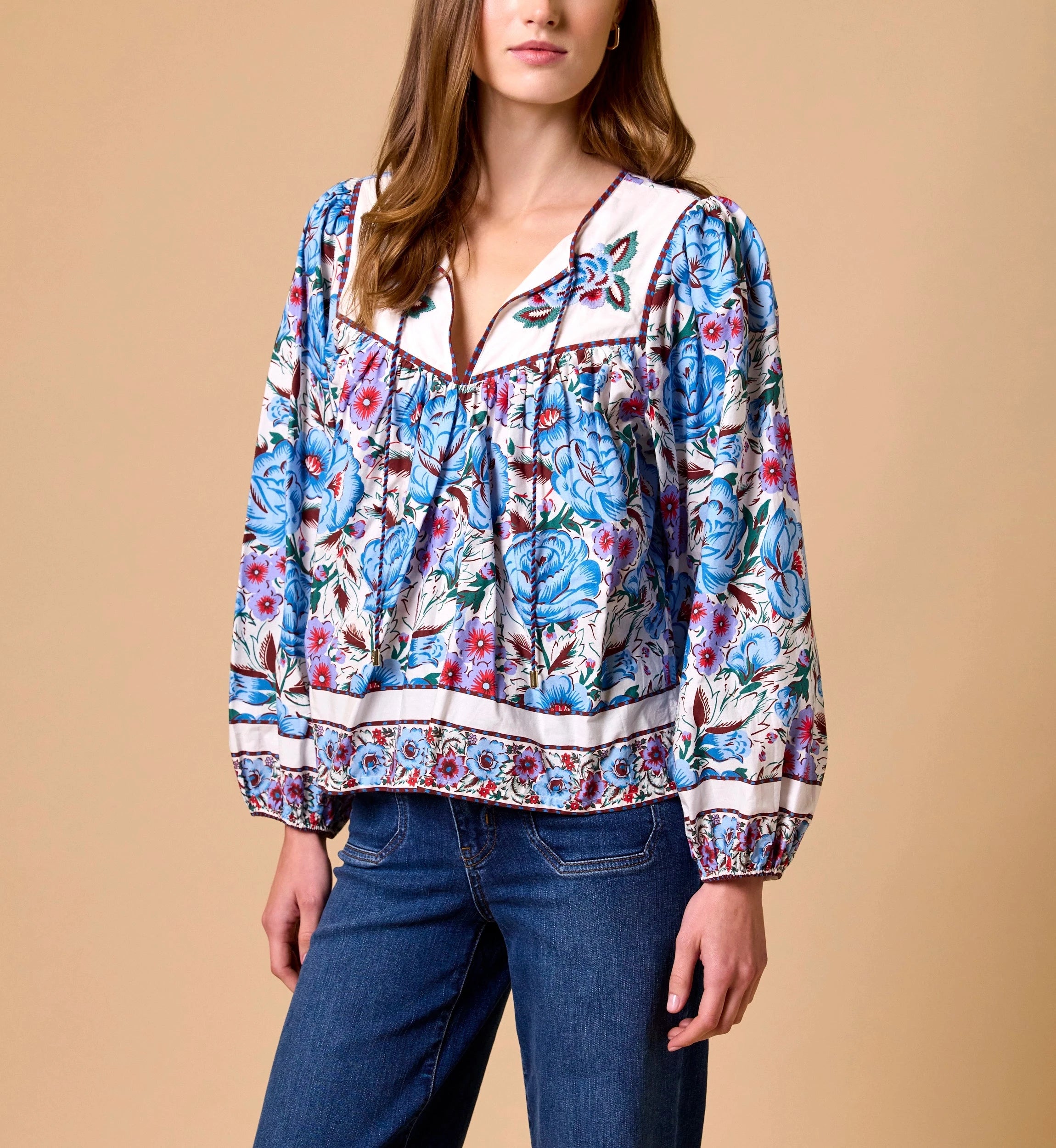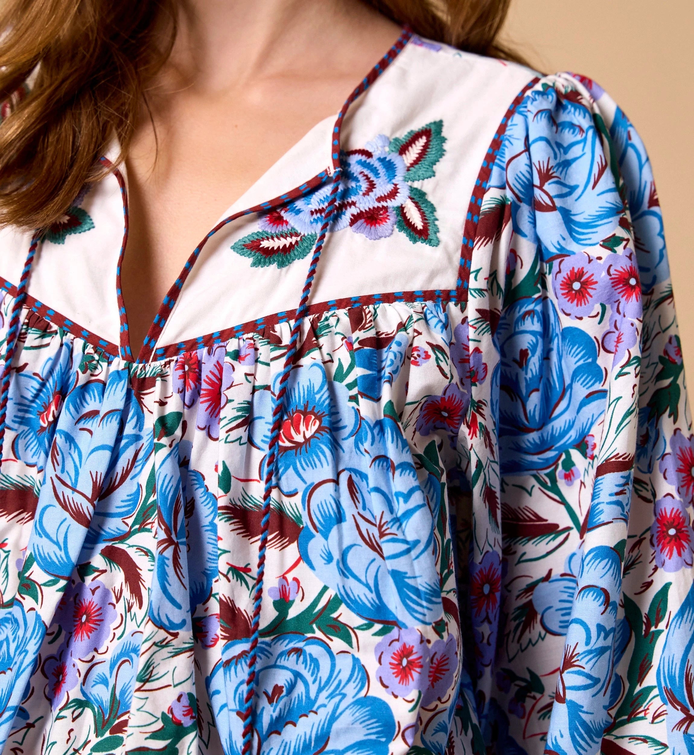The Laura Blouse features a vintage inspired floral print in a classic relaxed silhouette designed for comfort and everyday wear. This long sleeve top is detailed with a twisted tie at the neckline, finished with gold bead accents for a subtle touch of shine. Intricate embroidery at the front yoke adds thoughtful texture, while elasticated sleeve openings create a soft, gathered finish.