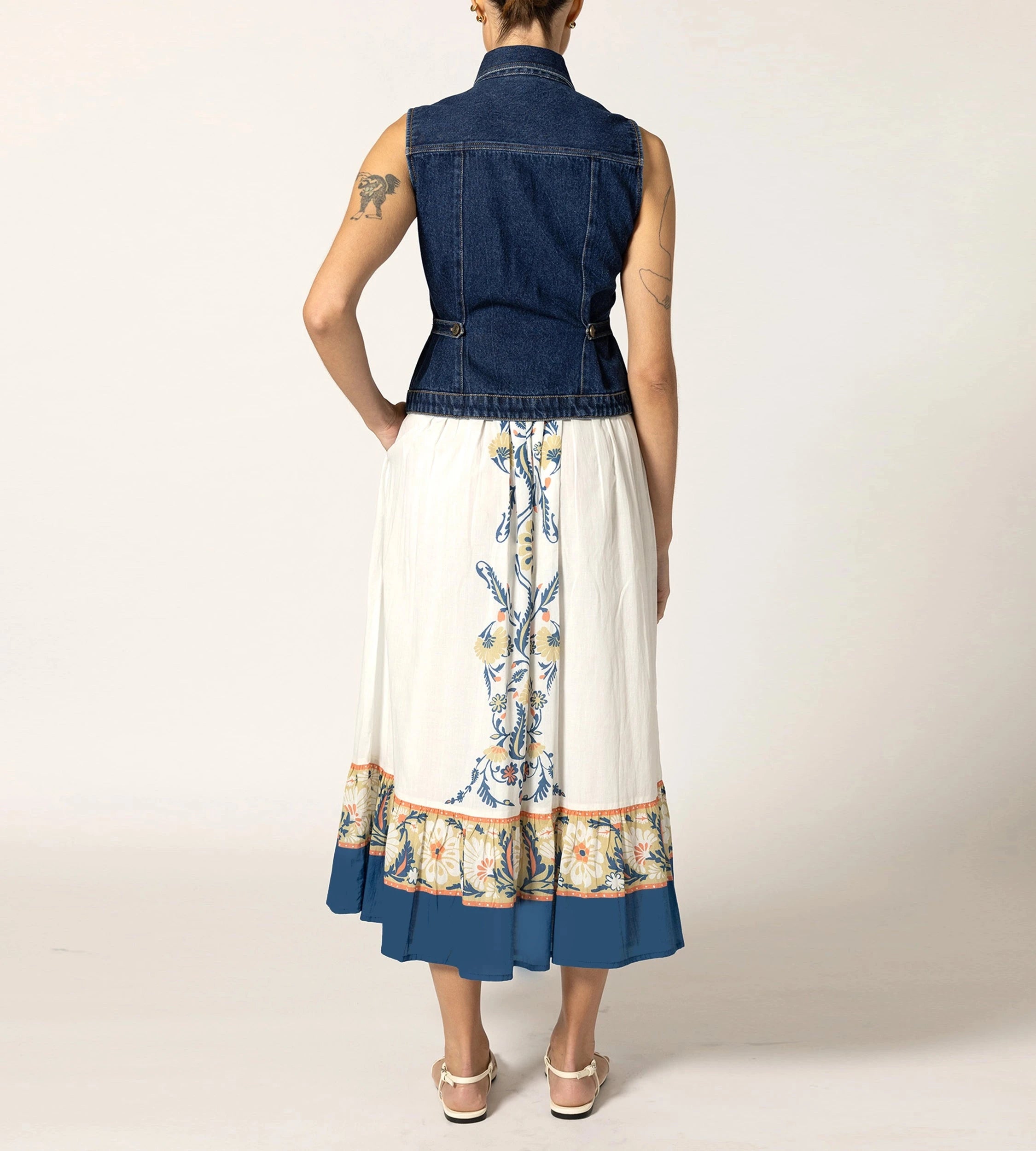 Ethically handmade in India from 100% GOTS organic cotton, the Matilda Ankle Skirt features an elasticated waistband at the back and flattering A-line silhouette. Elevated with a dreamy place print, the Matilda Ankle Skirt is perfect to pair with a denim vest or a lightweight sweater for a perfect fall look.