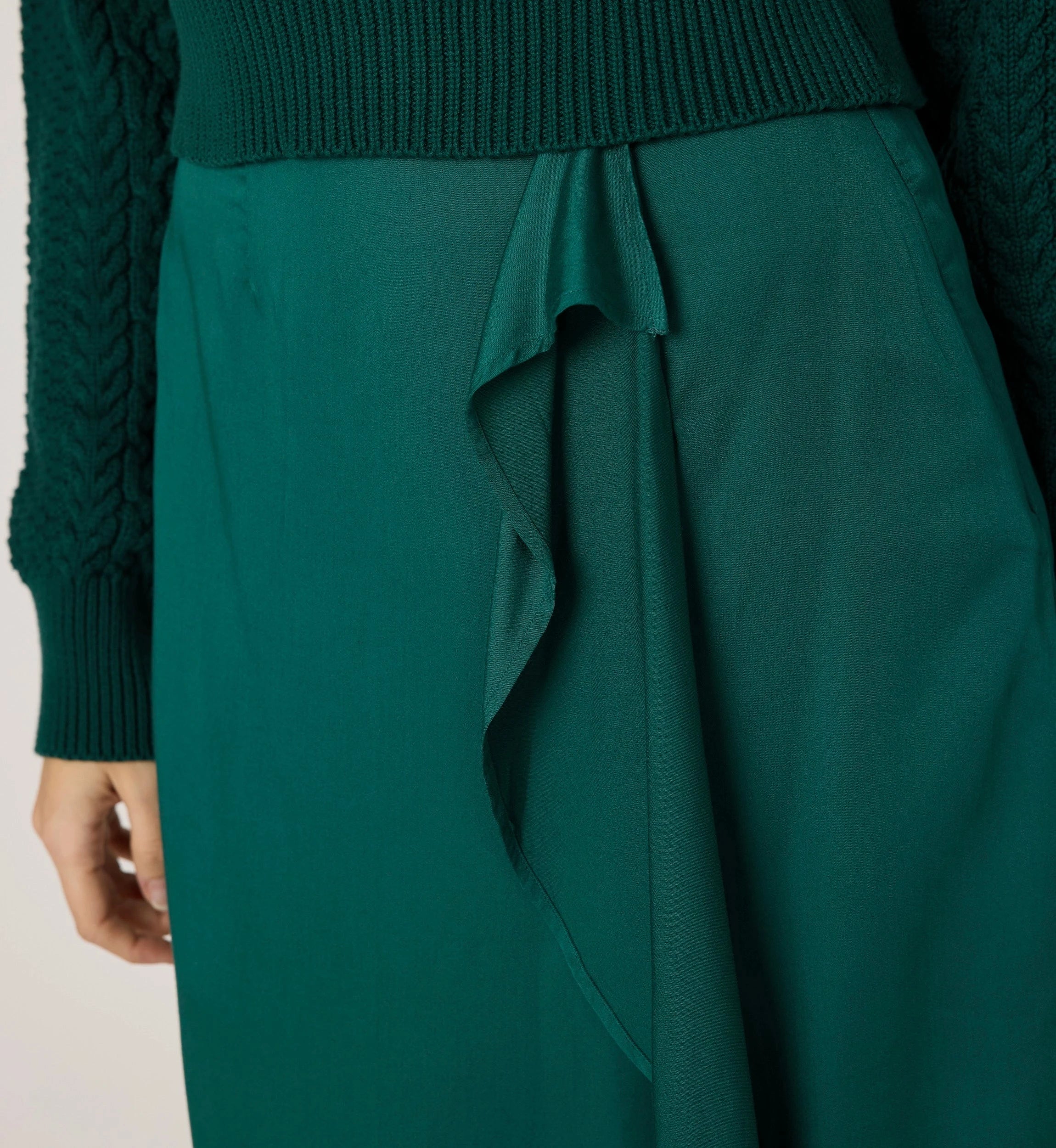 The Regina Midi Skirt is a versatile new silhouette designed for comfort and elegance. Ethically crafted from 100% viscose, this midi-length skirt stands out in a rich forest green hue. A smocked back waistband ensures all-day ease, while the adjustable waist tie can be styled in the front or back for added versatility. Effortless yet refined, the Regina Midi Skirt is a timeless staple that seamlessly transcends seasons.