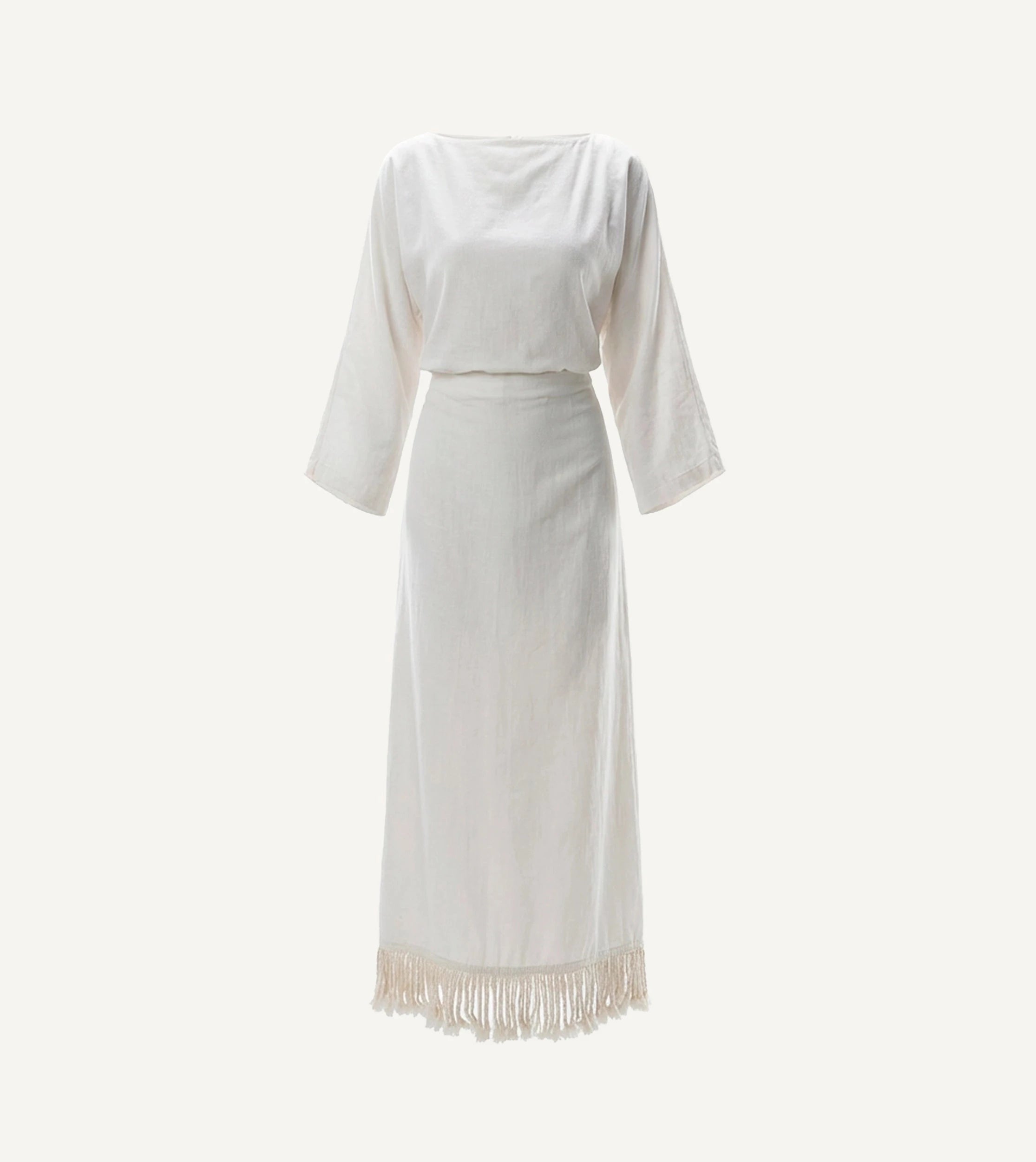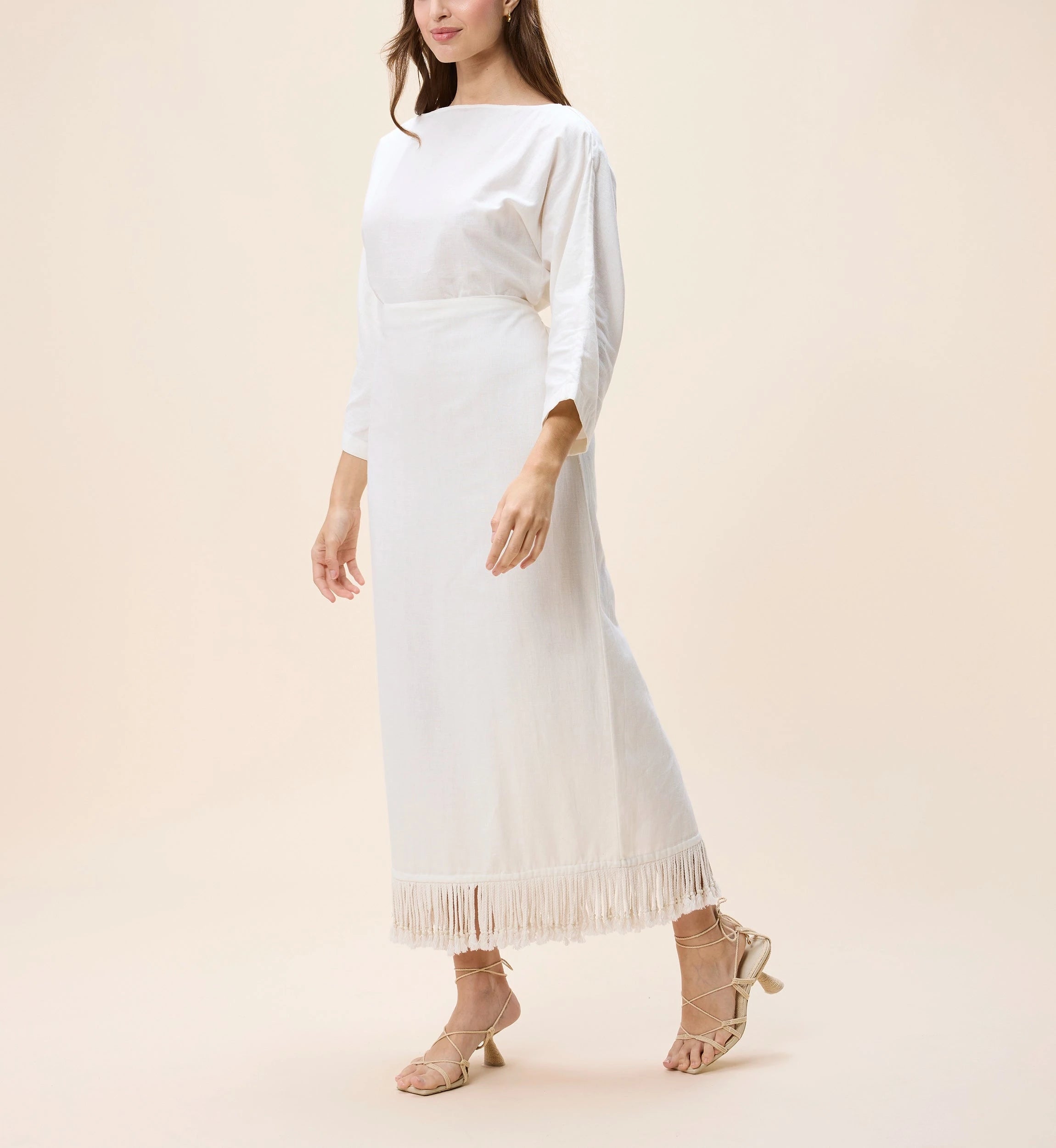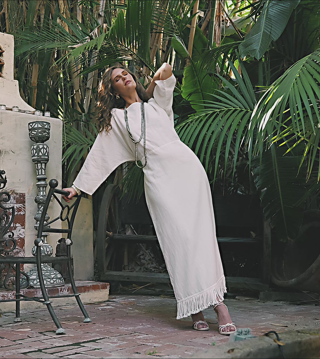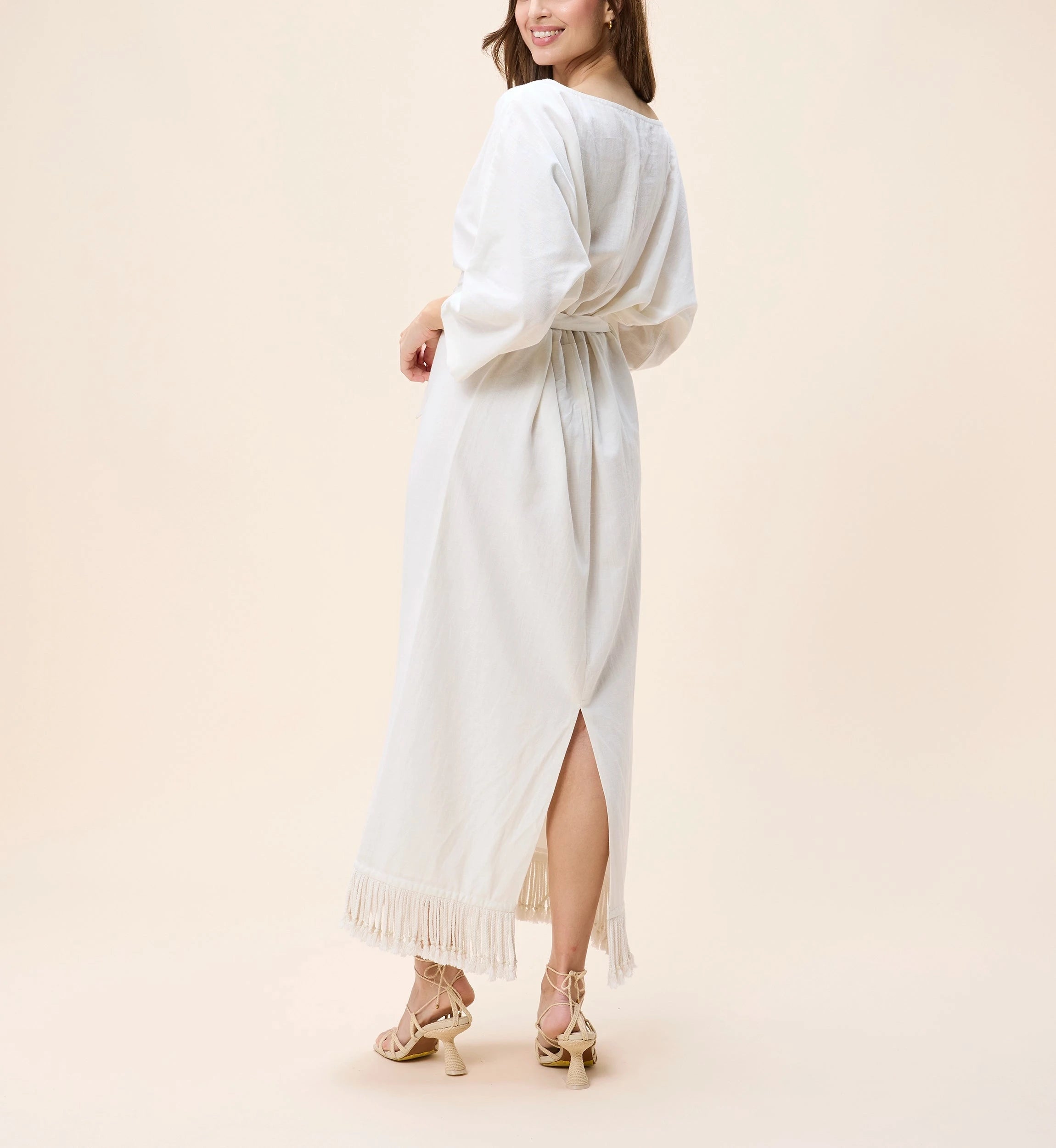 The Robin Ankle Dress embodies effortless elegance with its airy, free-flowing silhouette and thoughtful artisanal detailing. Designed with 3/4 sleeves and a removable sash, it allows you to shape the waist for a more fitted look or wear it loose for relaxed ease. Tassel fringe along the hem adds soft movement and a touch of bohemian charm, making this dress a beautiful choice for both everyday wear and getaway dressing.