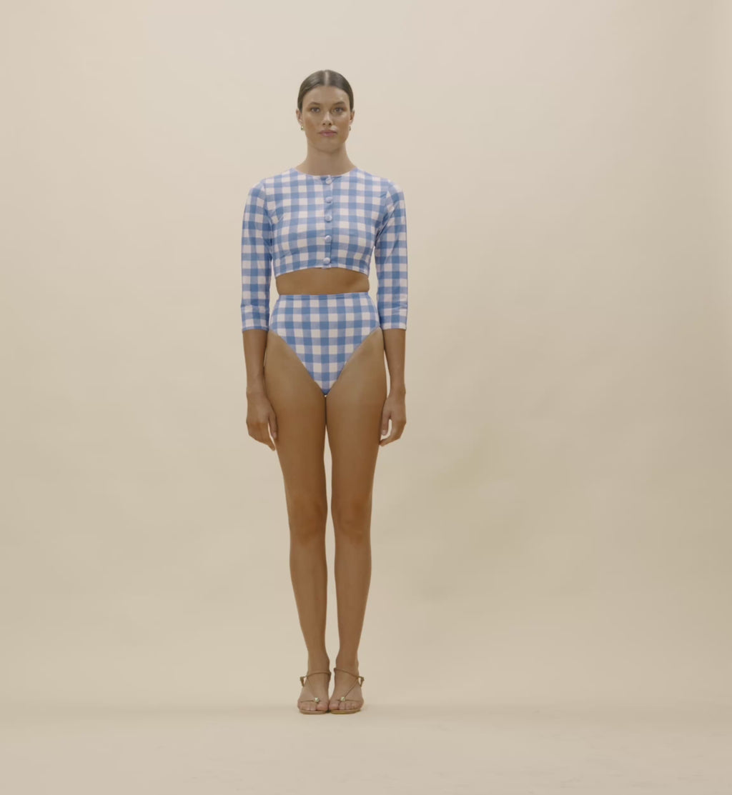 The Skye Rashguard is designed for sun filled adventures, featuring long sleeves and functional buttons down the center front for a refined, feminine touch. Perfect for active spring days by the water, pair it with the Kimber Bottom and Beckett Top for a complete, chic look.