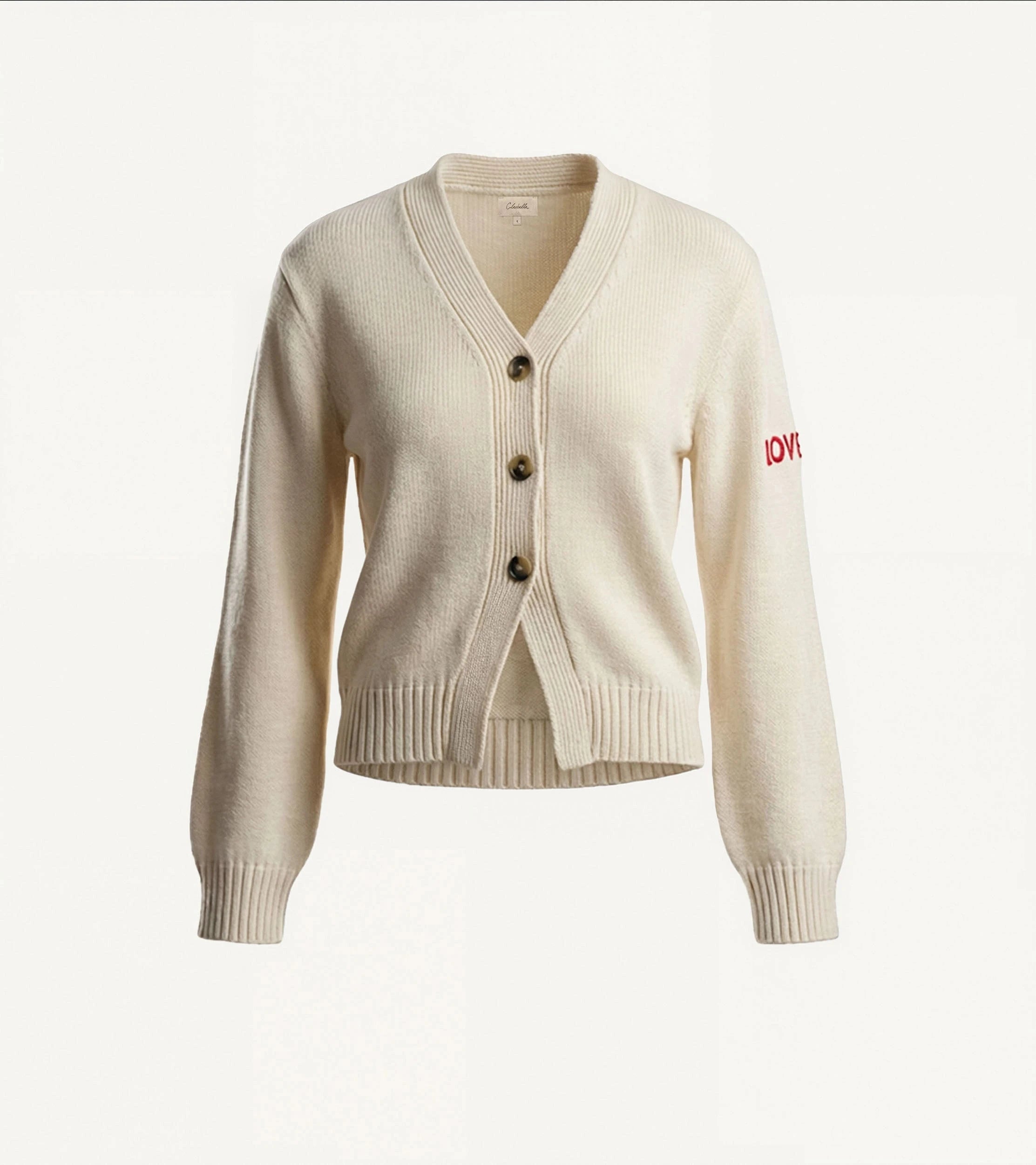 Meet the Tamsin Sweater, delicately knit from 100% organic cotton yarn. Designed with a row of buttons cascading down the center front, this timeless piece is finished with a subtle touch of love, sweetly embroidered along the sleeve. Effortless and heartfelt, it’s a cozy layer made for moments worth savoring.